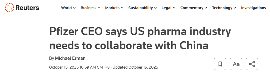 2025年10月15日,辉瑞公司首席执行官阿尔伯特·布尔拉(Albert Bourla)在美国–中国关系全国委员会晚宴上表示,美国制药行业亟须加强与中国在生物医药领域的合作。过去十年,中国凭借研发速度、成本与规模优势,已占全球药物研发约30%的份额。